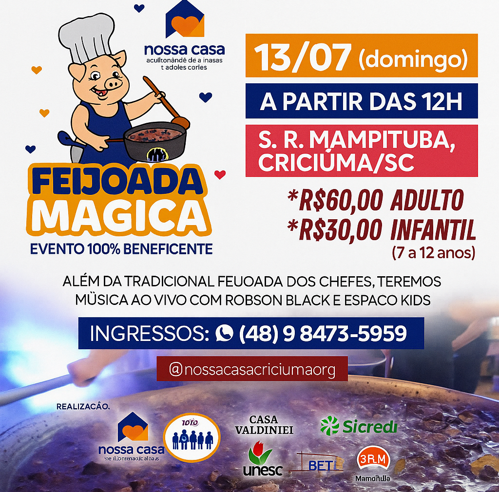 Associação Beneficente Nossa Casa, de Criciúma, promove neste domingo, dia 13 de julho, a “Feijoada Mágica”