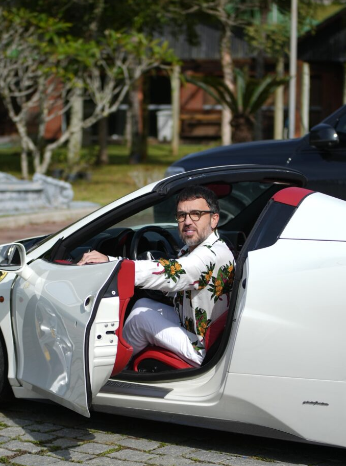 O anfitrião chegou a festa numa Ferrari modelo Spider 458, branca, conversível e brincou que o modelo era para combinar com sua roupa.