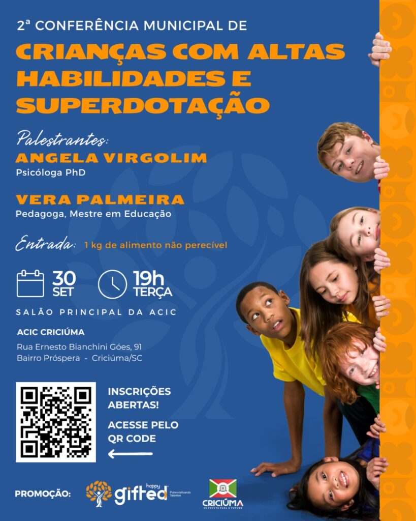 O Governo de Criciúma, por meio da Secretaria Municipal de Educação, em parceria com a Associação Beneficente Happy Face, promoverá, nesta terça-feira (30), a 2ª Conferência Municipal de Crianças com Altas Habilidades e Superdotação (AH/SD). A iniciativa acontecerá na Associação Empresarial de Criciúma (Acic), a partir das 19 horas, e reunirá profissionais da educação, especialistas com referência nacional e a comunidade escolar em um momento de troca de experiências, aprendizado e construção coletiva de estratégias para identificar e apoiar estudantes com potencial elevado.