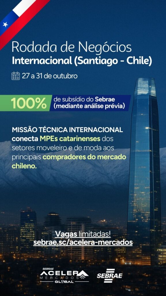 De 27 a 31 de outubro, três empresas do Sul de Santa Catarina estarão em Santiago, no Chile, para participar da Rodada de Negócios Internacional, um dos eventos mais estratégicos para a internacionalização de micro e pequenas empresas (MPEs) do estado. A missão técnica conecta os setores de moda e móveis catarinenses aos principais compradores do mercado chileno, ao oferecer oportunidades concretas de negócios, parcerias estratégicas e expansão para mercados internacionais.