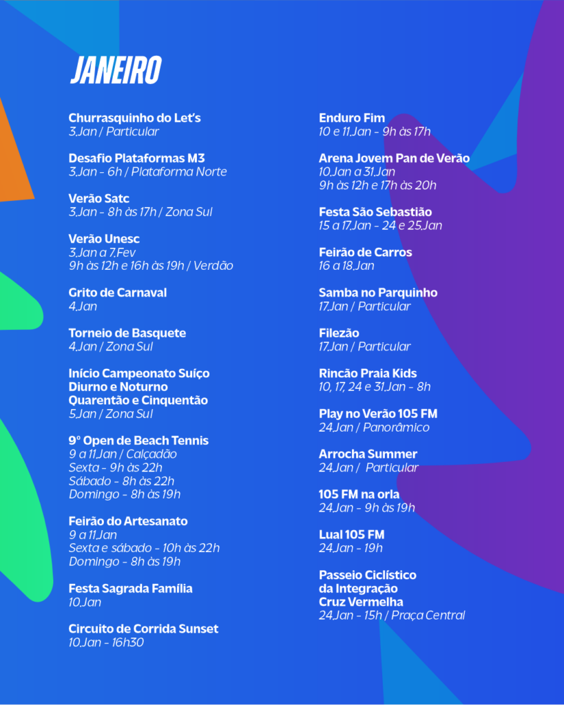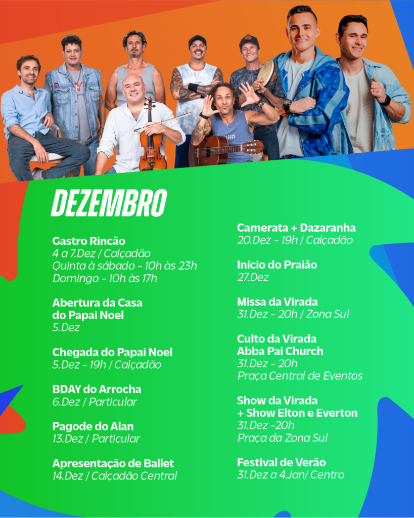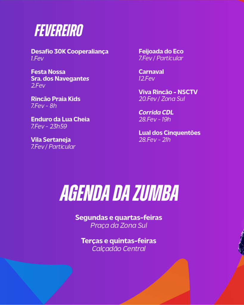 A programação, com os dias e horários dos eventos estão disponíveis no instagram oficial da Prefeitura de Balneário Rincão.